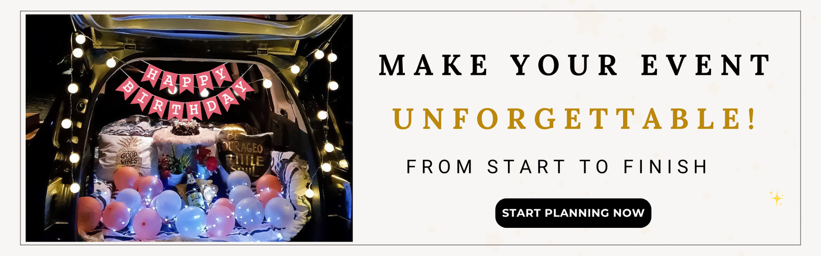 Thank you for making my husband's milestone birthday so special. The attention to detail was impeccable, and the ambiance created was simply stunning. Highly recommend!