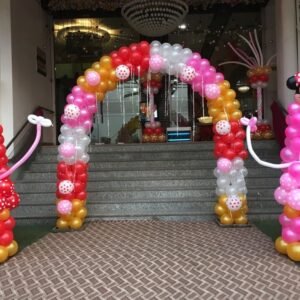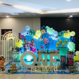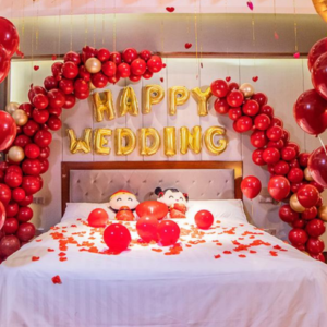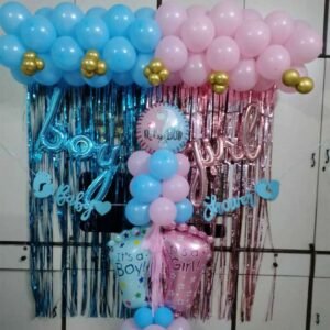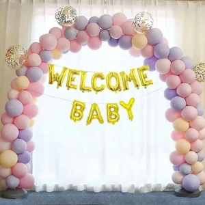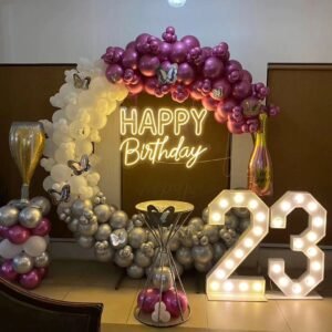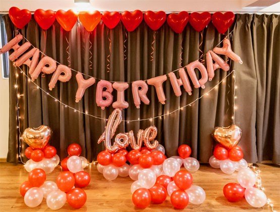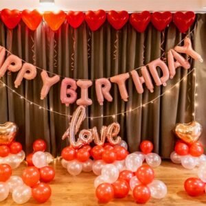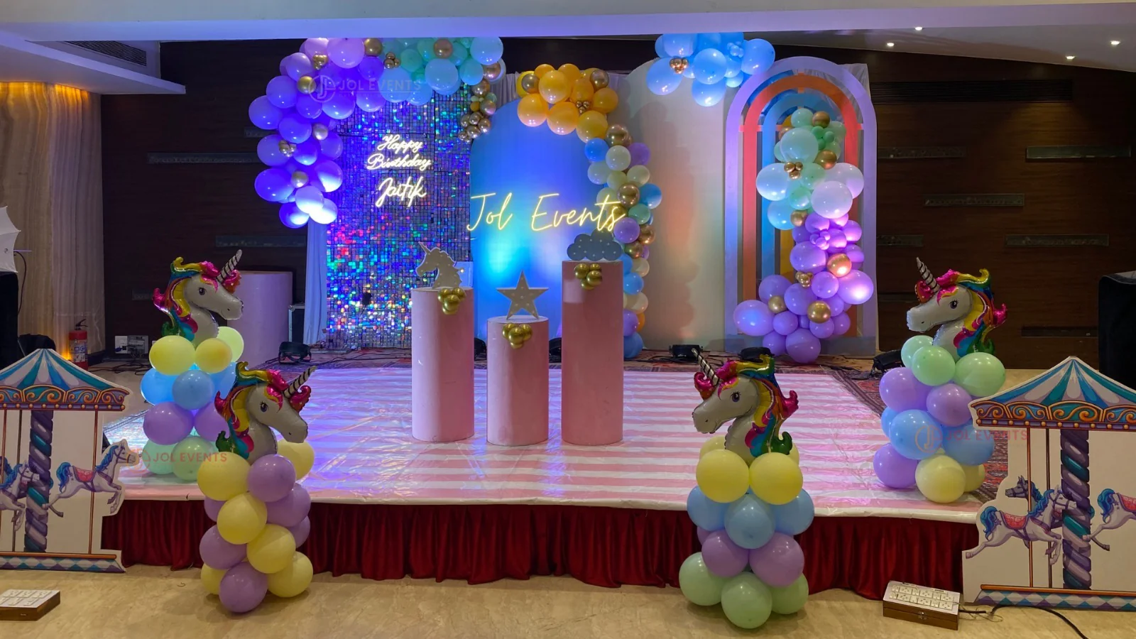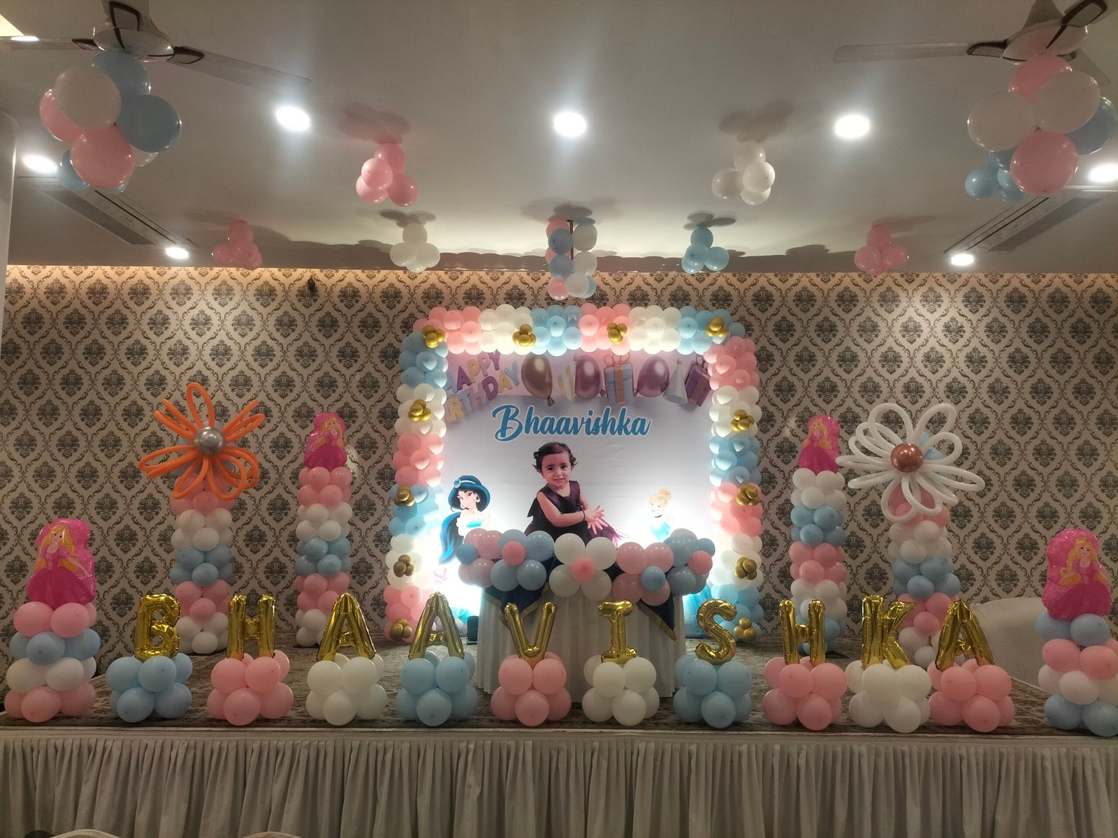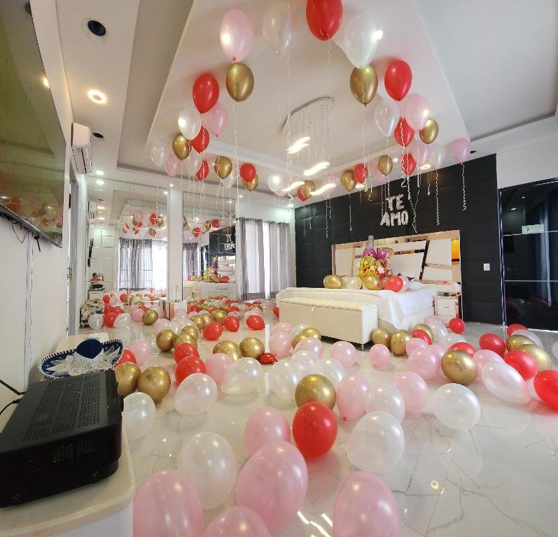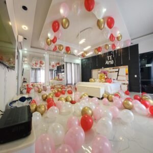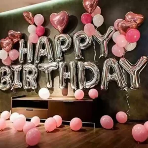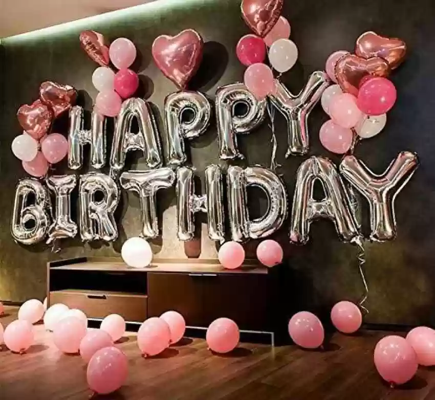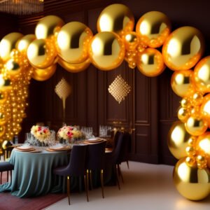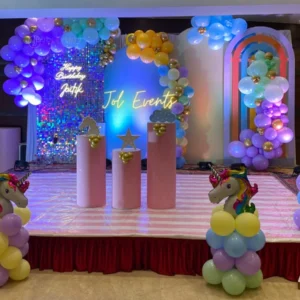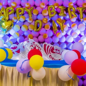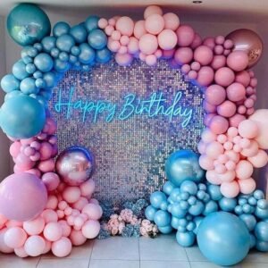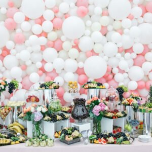Delicious wedding reception. Birthday Cake on a background balloons party decor. Copy space. Celebration concept. Trendy Cake. Candy bar. Table with sweets, candies, dessert.
