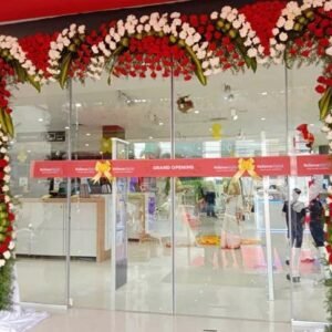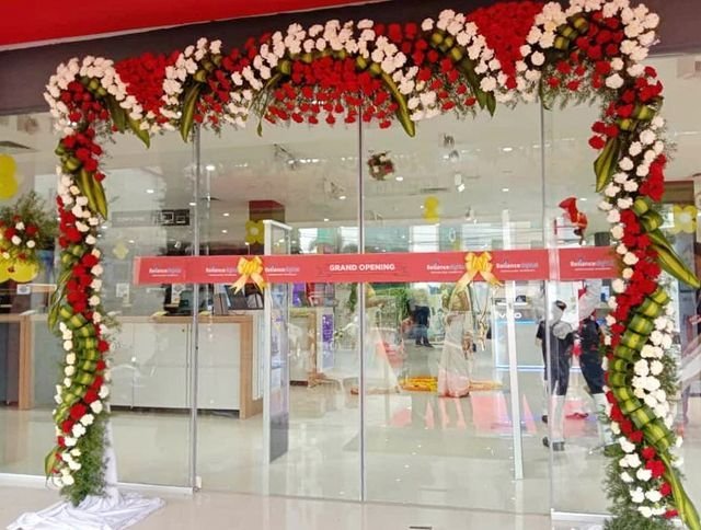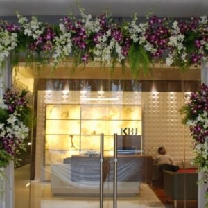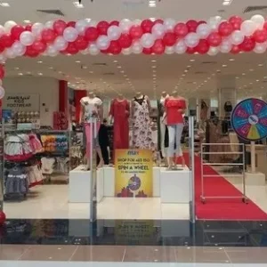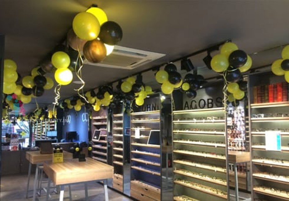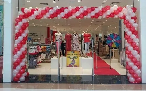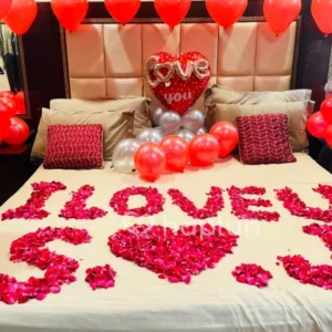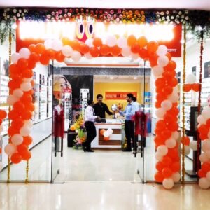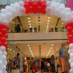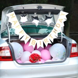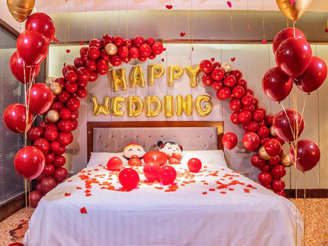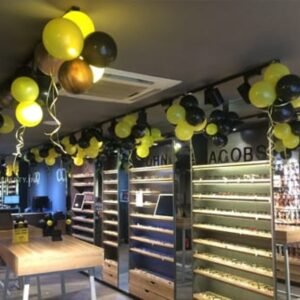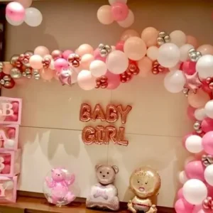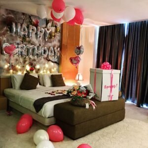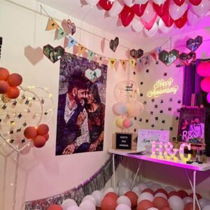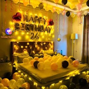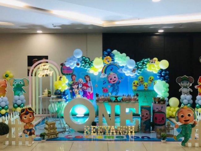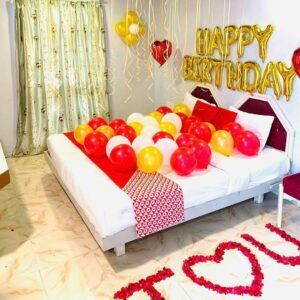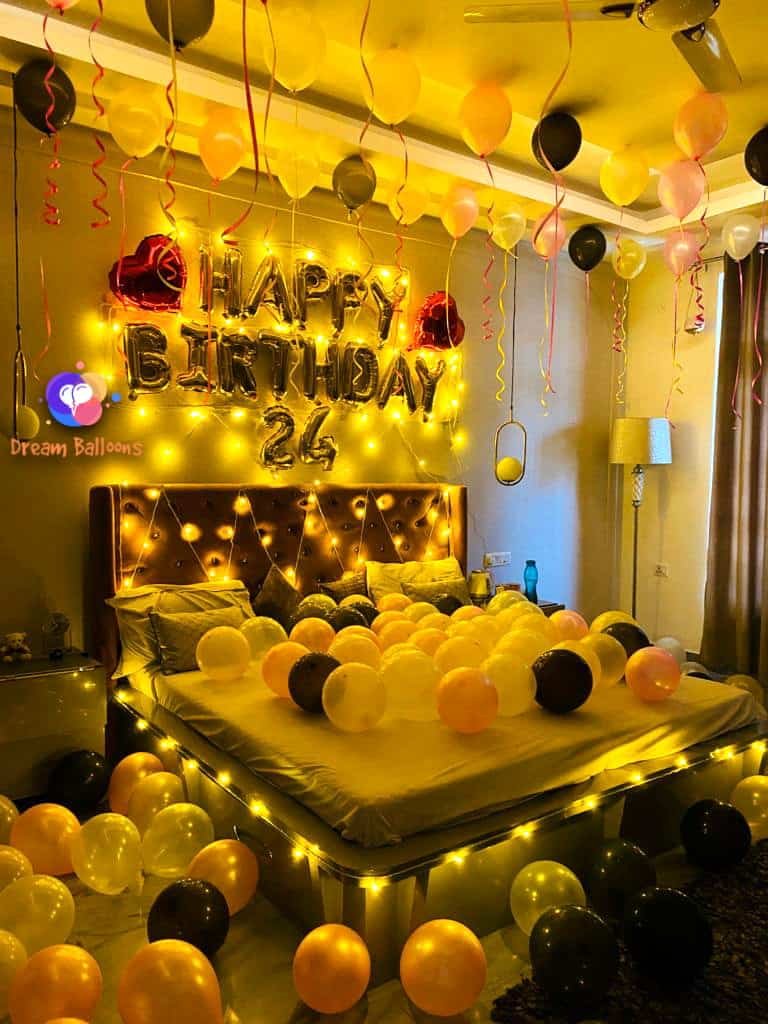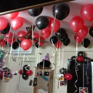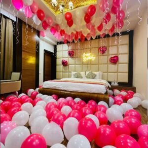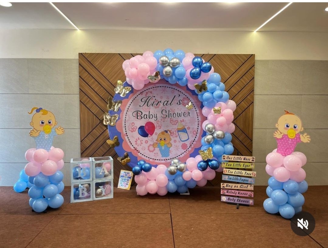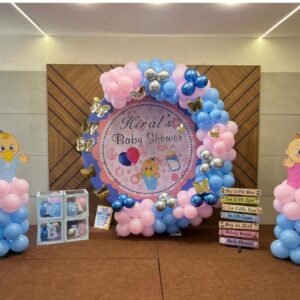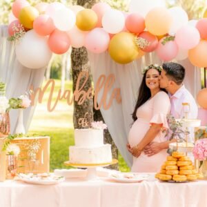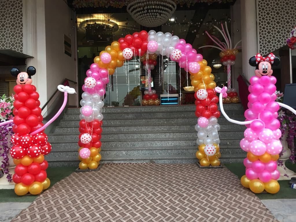 Delicious wedding reception. Birthday Cake on a background balloons party decor. Copy space. Celebration concept. Trendy Cake. Candy bar. Table with sweets, candies, dessert.
